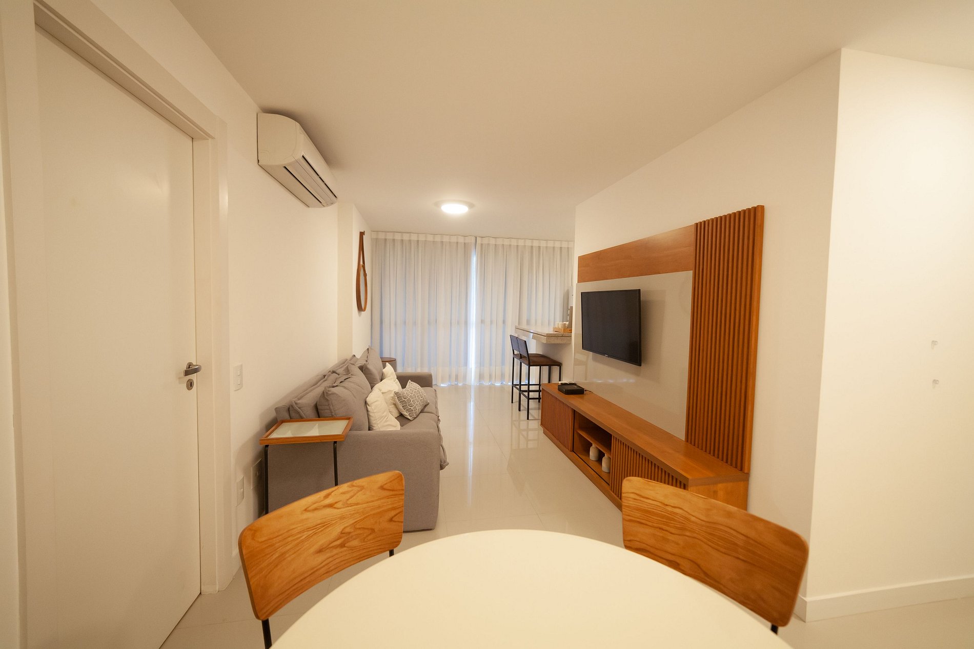 El salón cuenta con sofá cama, aire acondicionado, Smart TV de 32", mesa de comedor,