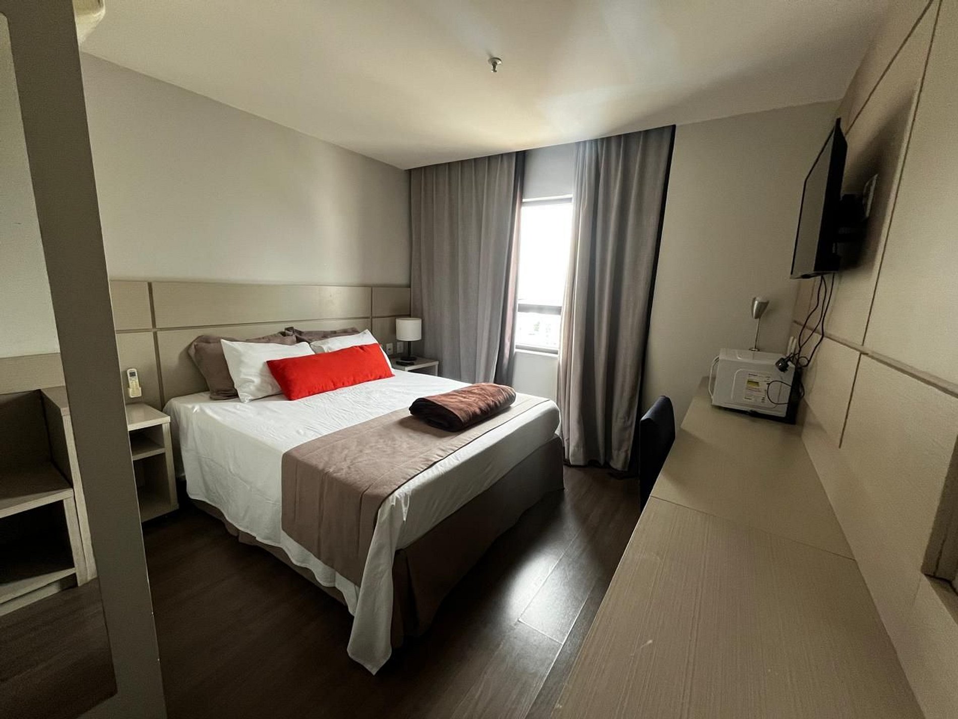 O flat 808 possui 18 m² e acomoda até 02 pessoas. É composto por cama de queen confortável, ar condicionado, Tv de 32 polegadas com ROKU, mesa para notebook, cofre eletrônico, ferro de passar, micro-ondas e secador de cabelo.
