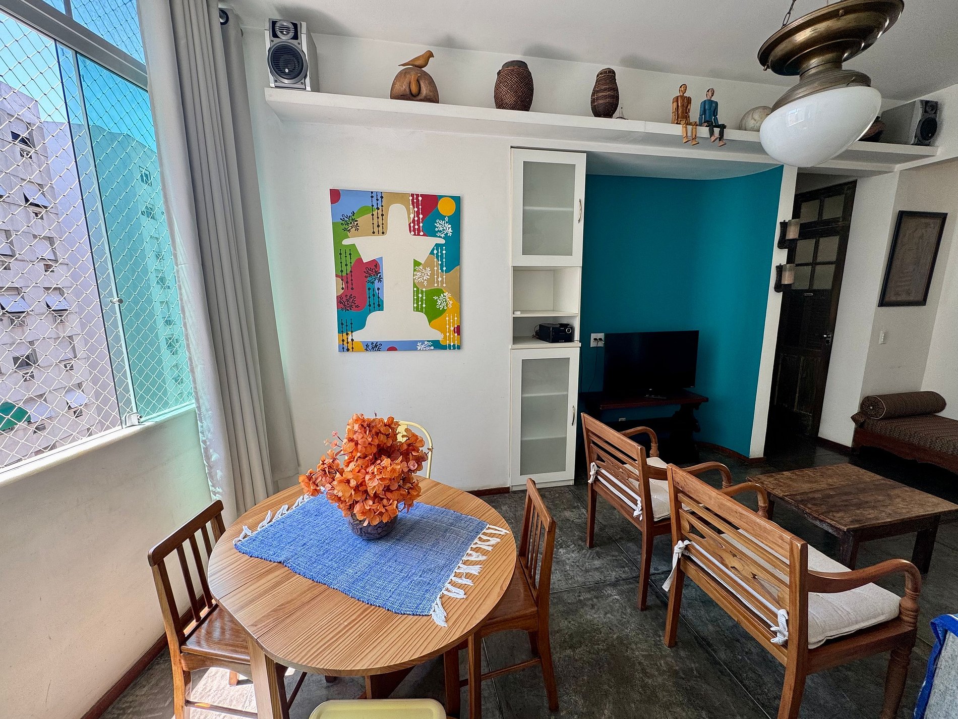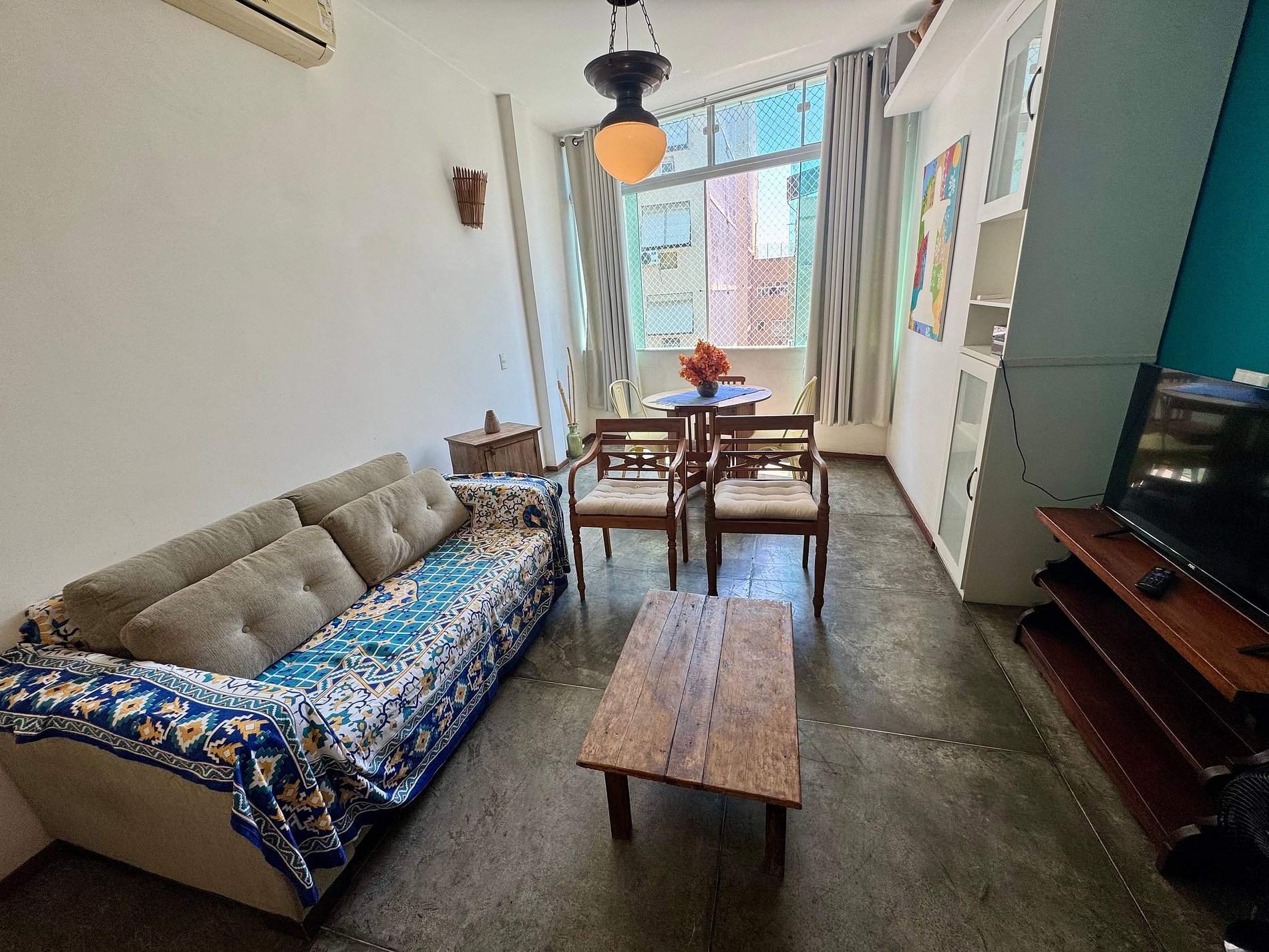 Sala ampla com sofá cama, cama de solteiro, Smart TV 35’, ar condicionado, Wi-fi, mesa de jantar e uma decoração aconchegante.