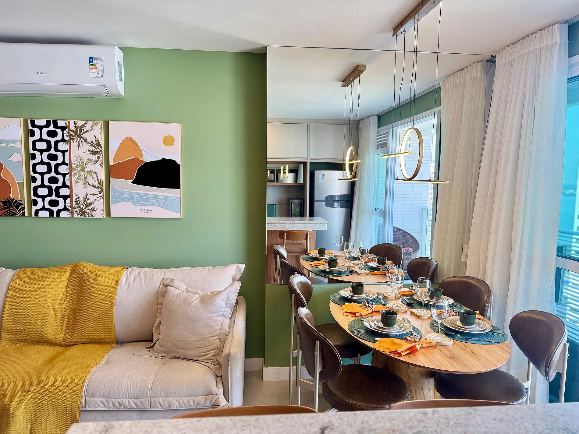 A sala é composta com sofá-cama, ar-condicionado, Smart TV de 32", mesa para jantar,