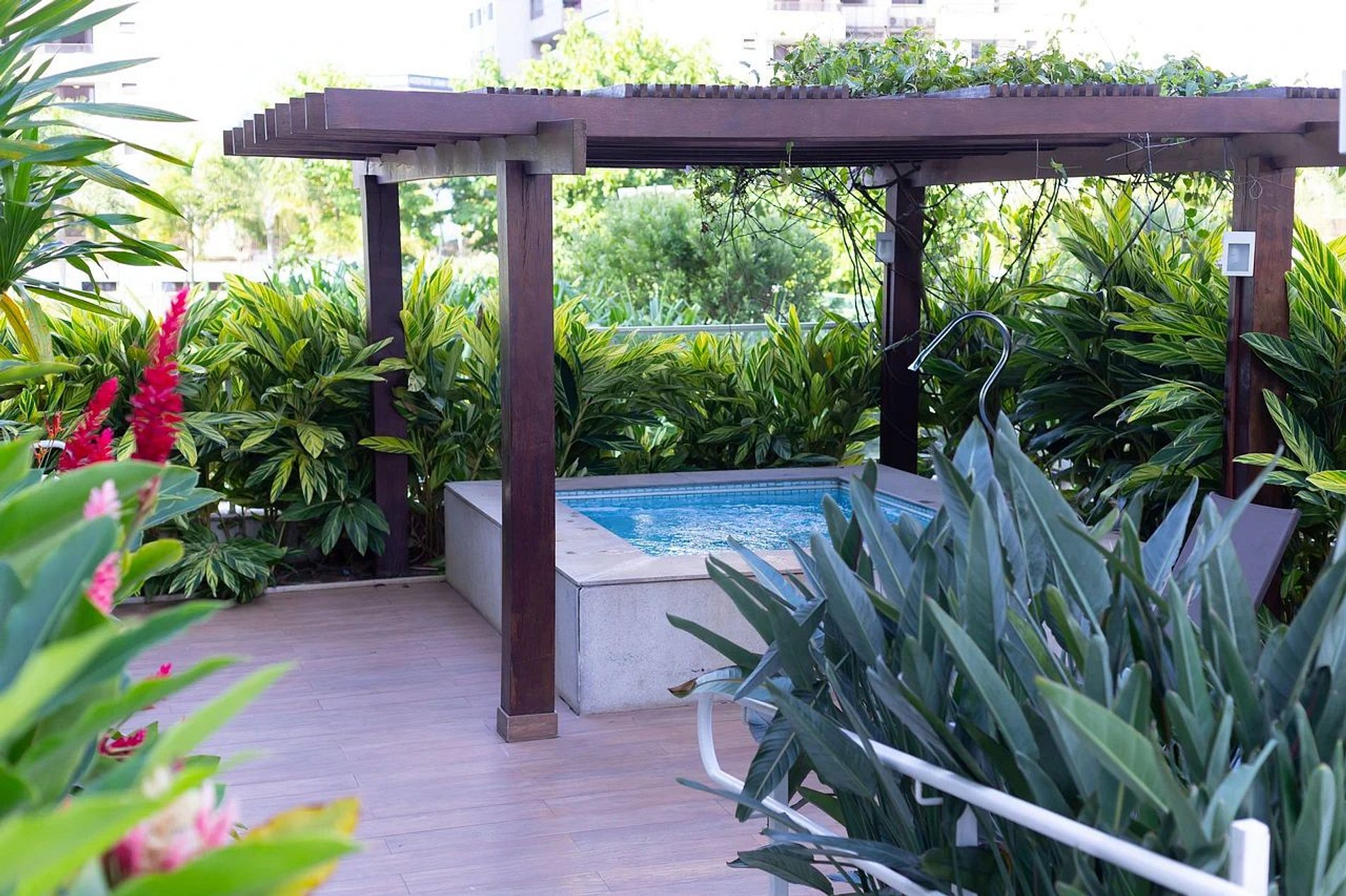Varanda ampla com uma vista incrível para a área de lazer.