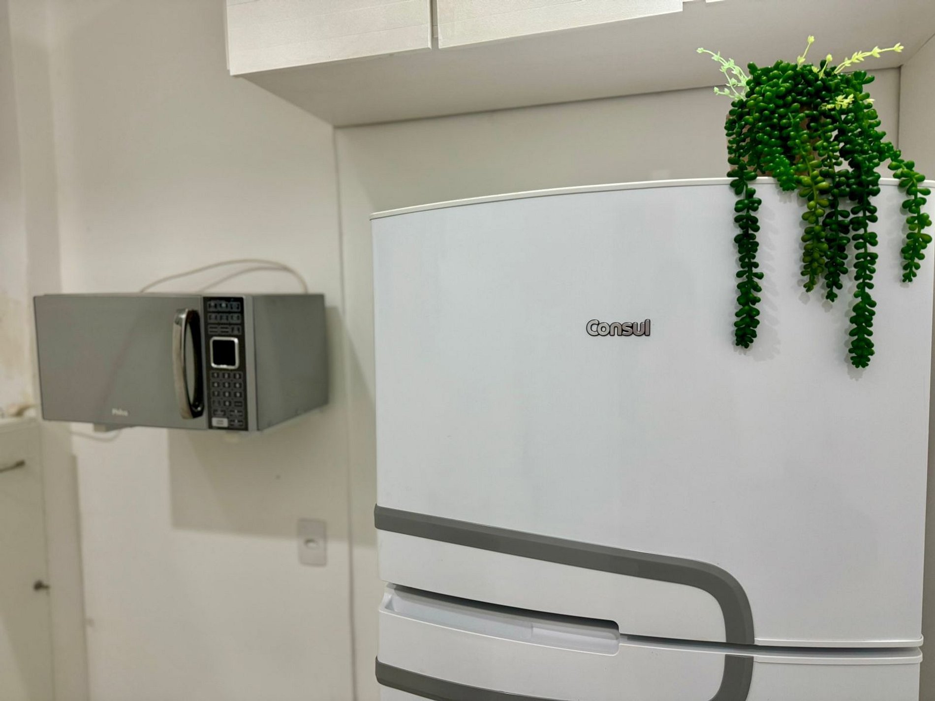 Cozinha equipada com geladeira, micro-ondas, cafeteira, fogão, conjuntos de panelas, além de utensílios básicos de cozinha.