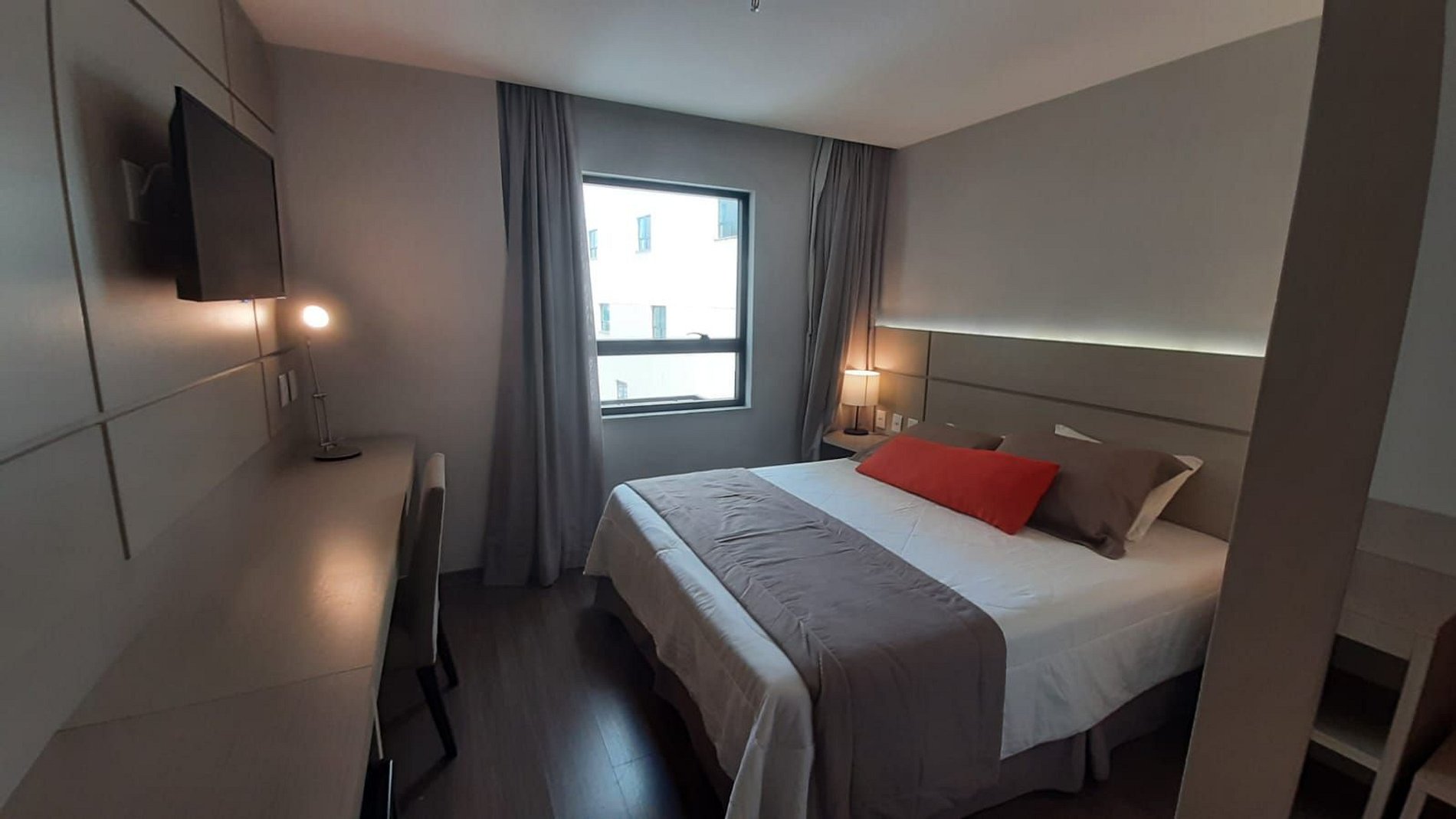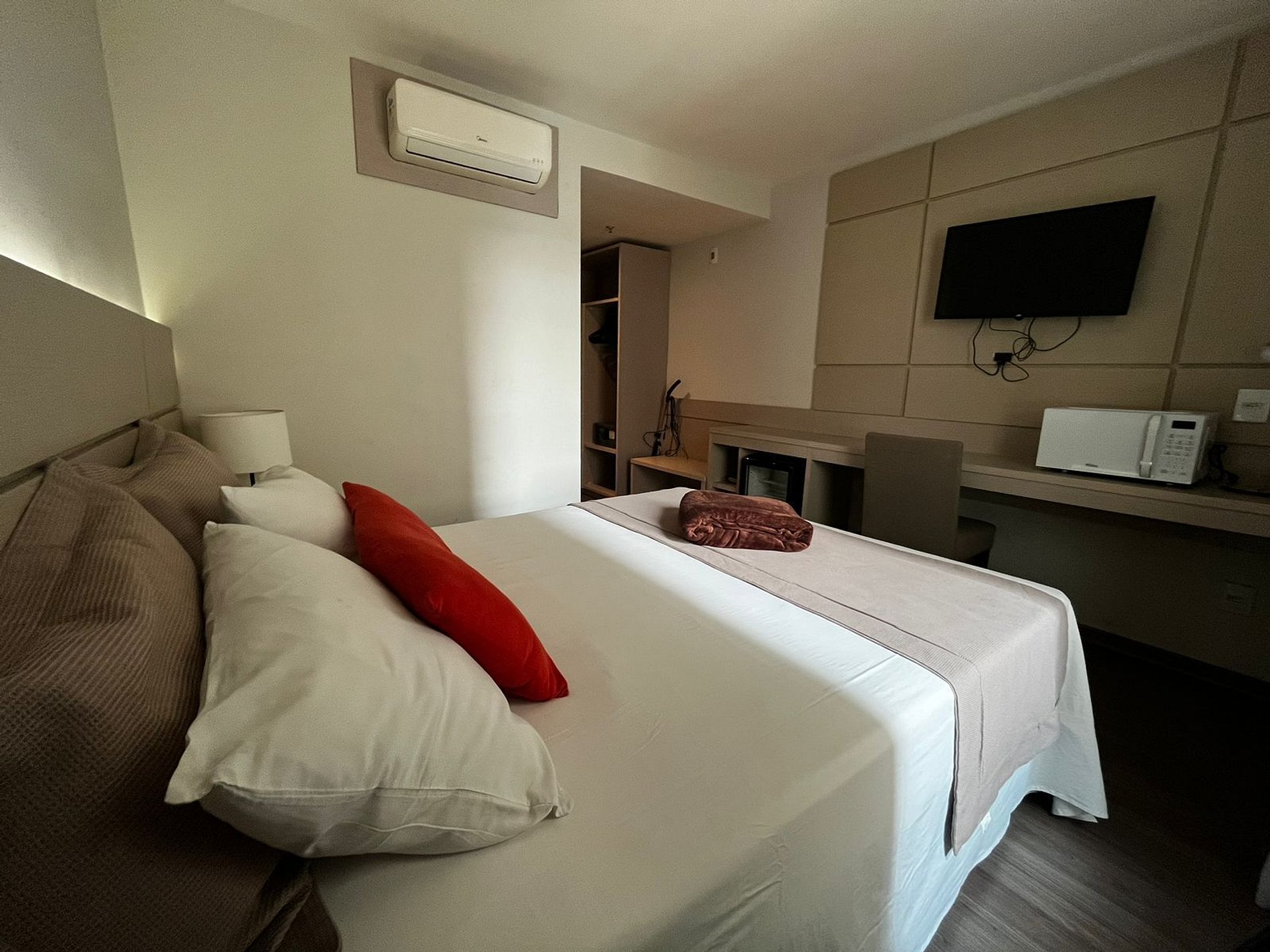 O flat 807 possui 18 m² e acomoda até 02 pessoas. É composto por cama de queen confortável, ar condicionado, Tv de 32 polegadas com ROKU, mesa para notebook, cofre eletrônico, ferro de passar, micro-ondas e secador de cabelo.