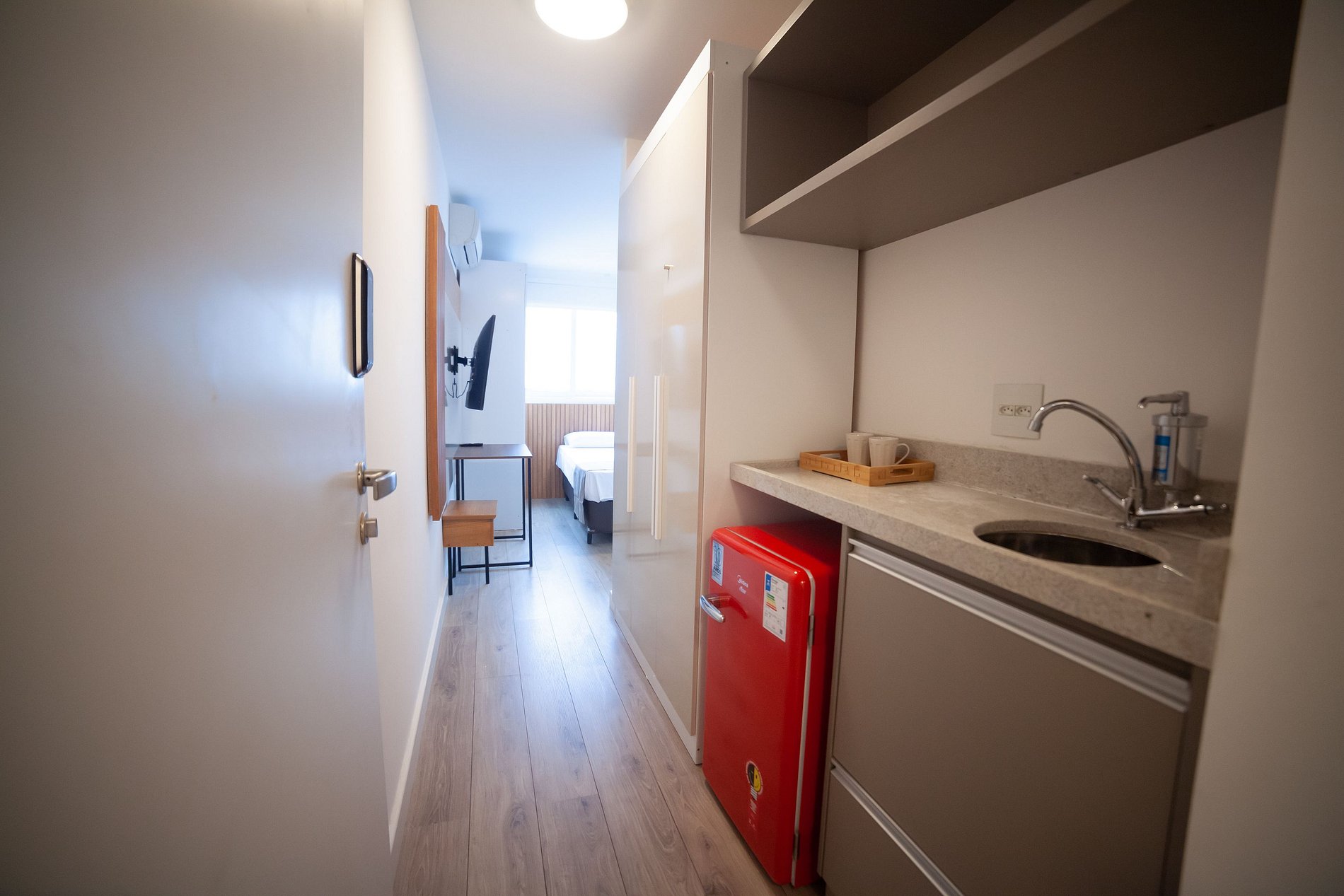 Frigobar, micro-ondas e armários planejados, proporcionando conforto e praticidade para os hóspedes.